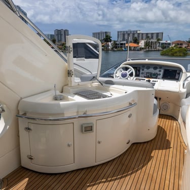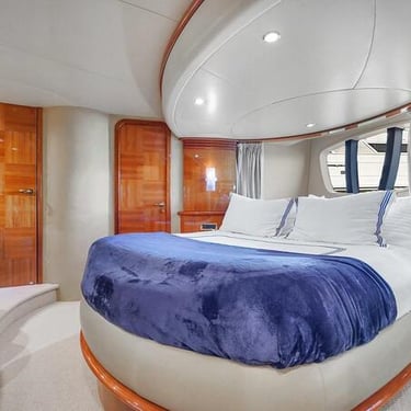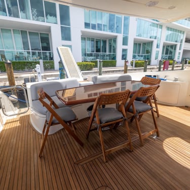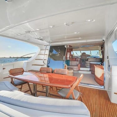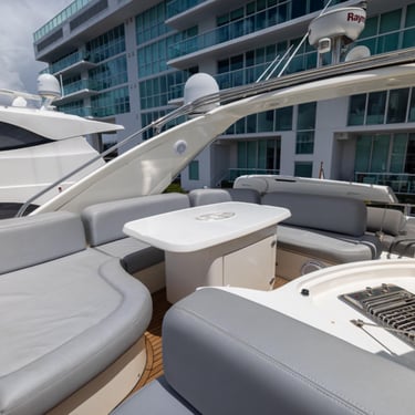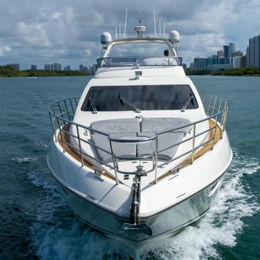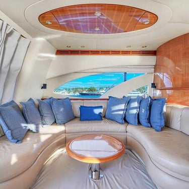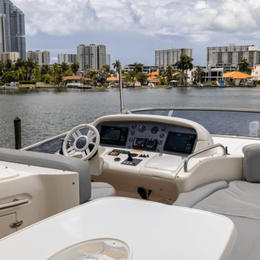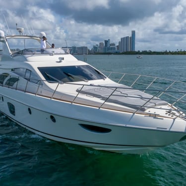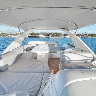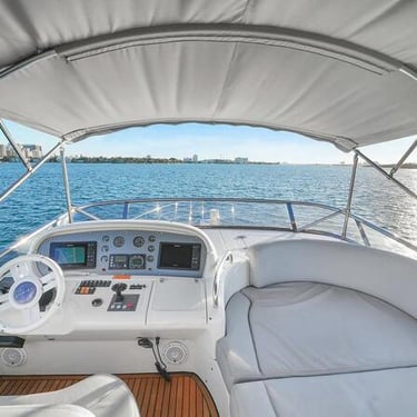 With a spacious layout and elegant design, this yacht is perfect for both relaxing and celebrating. The flybridge offers an elevated seating area with stunning views of the Miami skyline, while the interior provides a comfortable, air-conditioned space to unwind.
